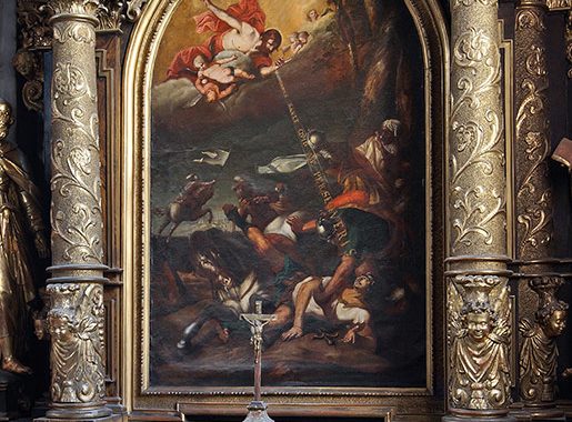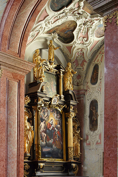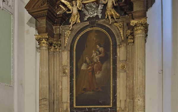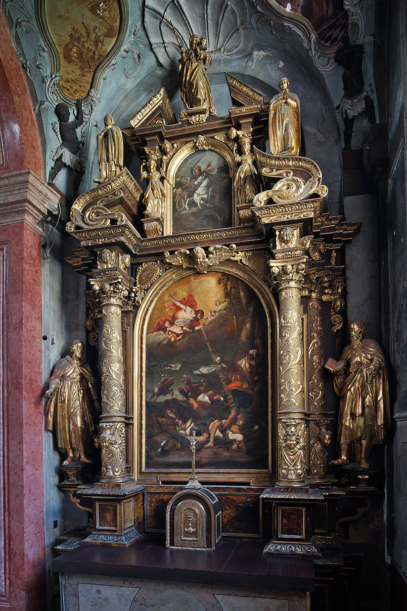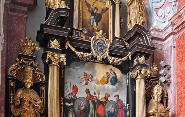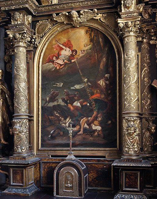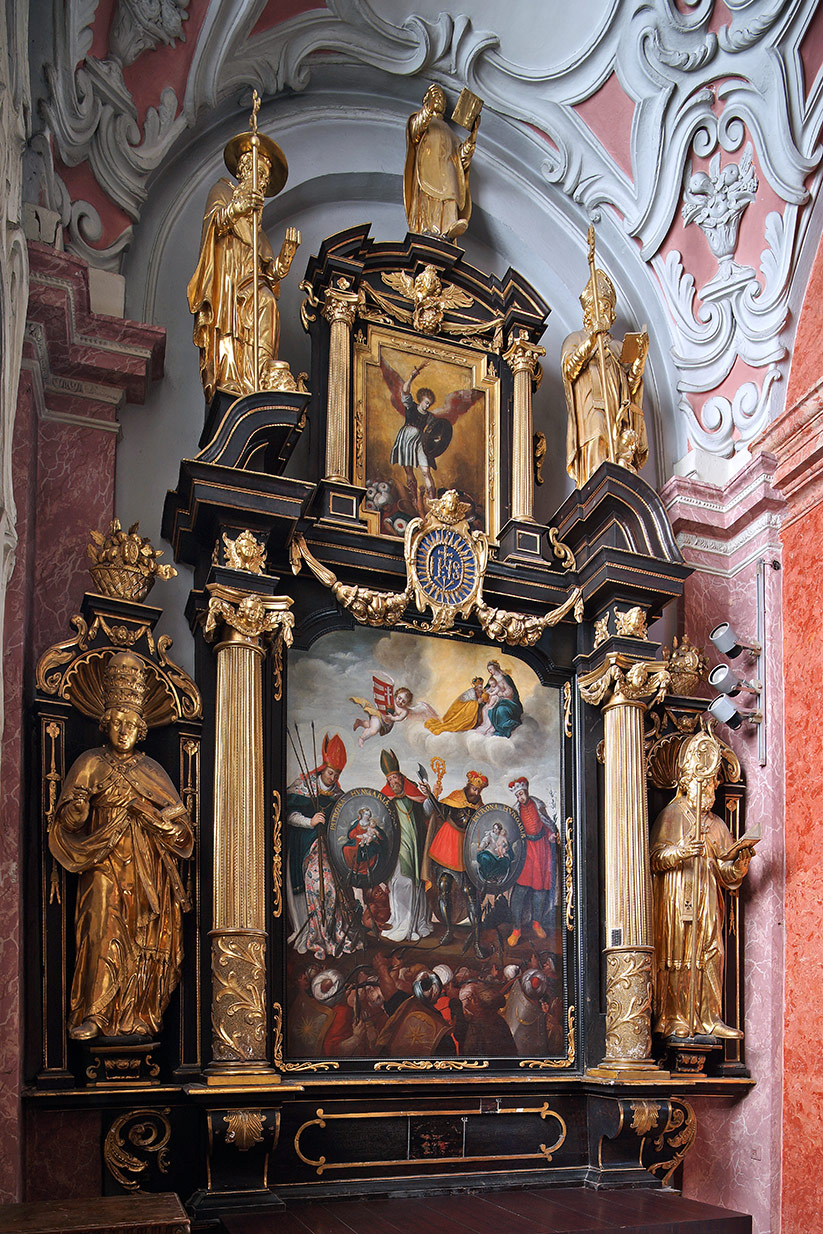 A félköríves záródású középképen balra Szent Gellért püspök látható, mellette Szent Adalbert püspök. A két szent a Patrona Hungariae képével es nevével díszített ovális pajzsot maga elé tartva fogja fel az előtér török seregének nyilait. Jobbra Szent László és a liliomot tartó Szent Imre látható, akik az előzőkhöz hasonló pajzsot tartanak. A kompozíció forrásául Pázmány Péter „Isteni Igazságra Vezérlő Kalauz”-ának rézmetszésű címlapja szolgált. Jobbra fent Szent István koronafelajánlását látjuk. Az oltárképtől balra Nagy Szent Gergely, jobbra Szent Ambrus egyházatyák állnak. Az oromképen Szent Mihály arkangyal lángpallosával a sátánra es az előtérben látható, tévtanokat megtestesítő törökök és protestáns hittudósok csoportjára sújt. Az oromkép csúcsán Szent Ignác, baloldalán Szent Jeromos, jobb felén Szent Ágoston aranyozott szobrai láthatók. Az oltár donátora Péchy Ferenc nemesúr volt (1642).