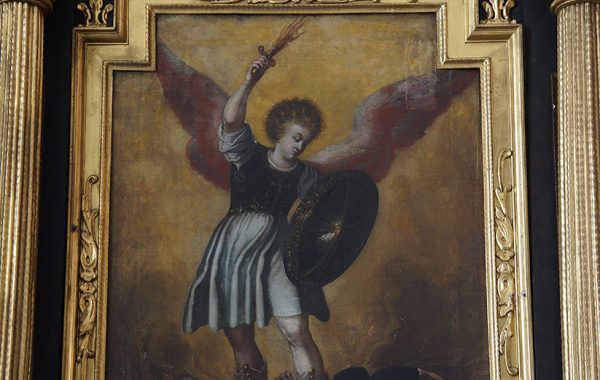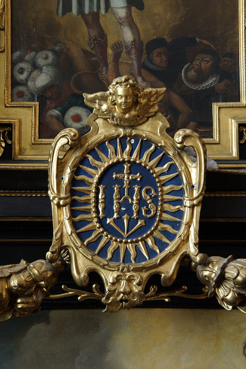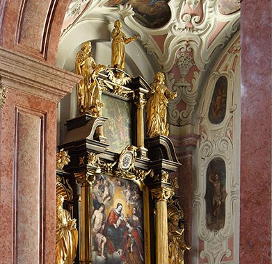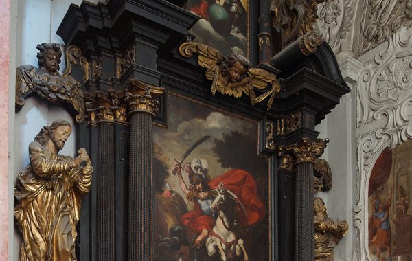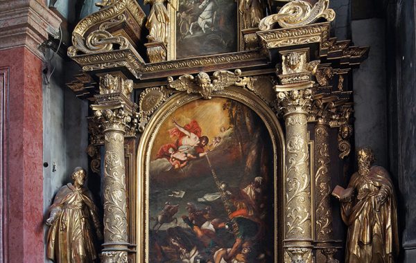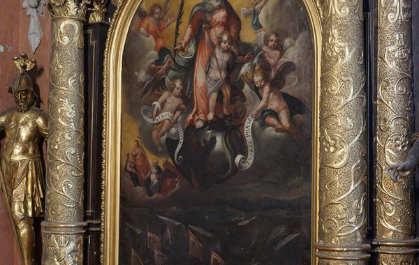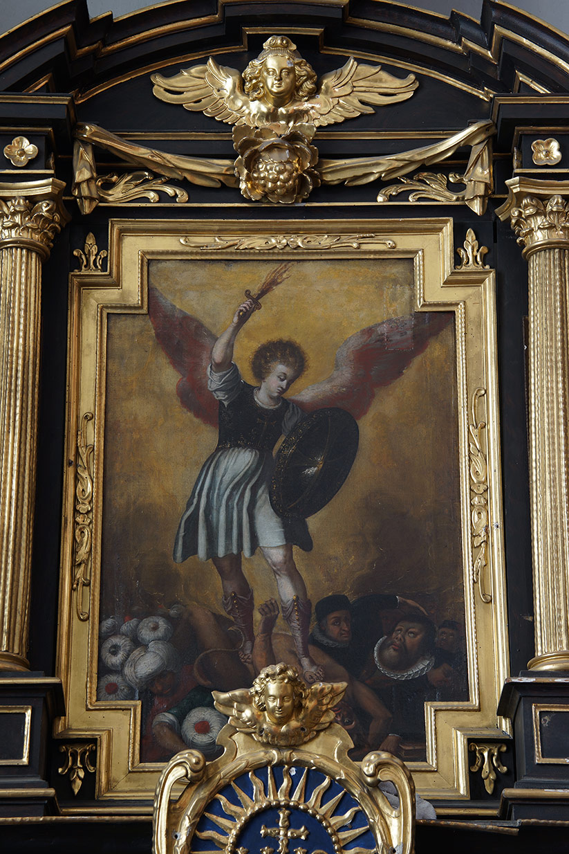 A félköríves záródású középképen balra Szent Gellért püspök látható, mellette Szent Adalbert püspök. A két szent a Patrona Hungariae képével es nevével díszített ovális pajzsot maga elé tartva fogja fel az előtér török seregének nyilait. Jobbra Szent László és a liliomot tartó Szent Imre látható, akik az előzőkhöz hasonló pajzsot tartanak. A kompozíció forrásául Pázmány Péter „Isteni Igazságra Vezérlő Kalauz”-ának rézmetszésű címlapja szolgált. Jobbra fent Szent István koronafelajánlását látjuk. Az oltárképtől balra Nagy Szent Gergely, jobbra Szent Ambrus egyházatyák állnak. Az oromképen Szent Mihály arkangyal lángpallosával a sátánra es az előtérben látható, tévtanokat megtestesítő törökök és protestáns hittudósok csoportjára sújt. Az oromkép csúcsán Szent Ignác, baloldalán Szent Jeromos, jobb felén Szent Ágoston aranyozott szobrai láthatók. Az oltár donátora Péchy Ferenc nemesúr volt (1642).