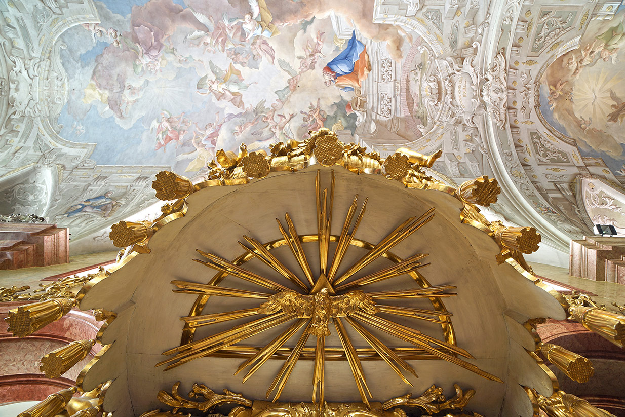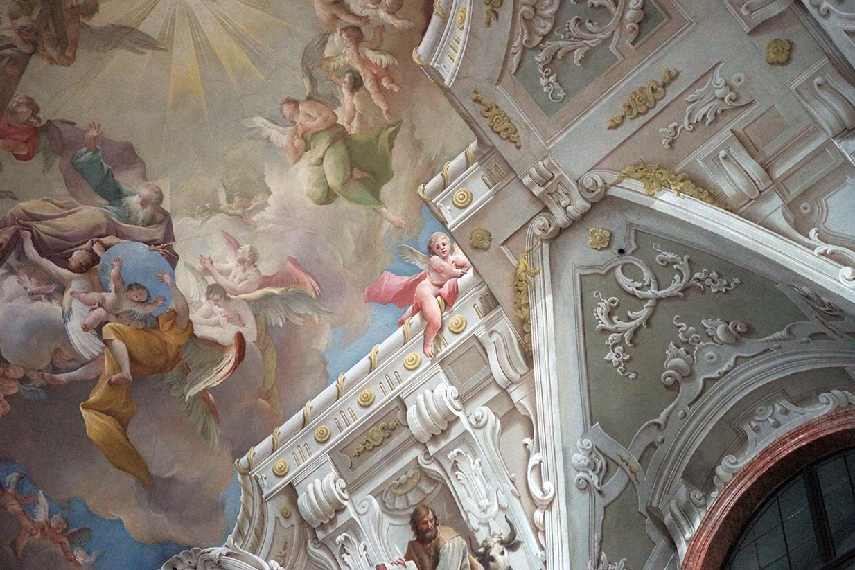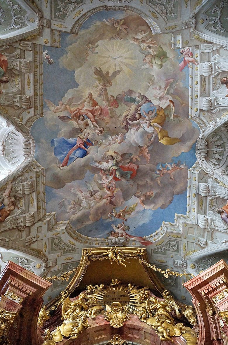 A templom freskóit a tiroli származású, itáliai tanultságú, majd Bécsben letelepedő és az Akadémia vezető mestereként számon tartott Paul Troger alkotta. A szentély mennyezetén Szent Ignác lelkének mennybevitele látható, mely színezésében főként velencei mintaképeket követ, plasztikus ereje, sodró lendülete révén viszont Gian Lorenzo Bernini „Theatrum sacrum”-ának festett változata. A mennyezet pillérkötegre lefutó, trapéz alakú mezőiben a négy evangélista figurája jelenik meg. Lukács alakja egyben Troger önarcképe, írótábláján a mester szignójával és 1744-es dátummal.