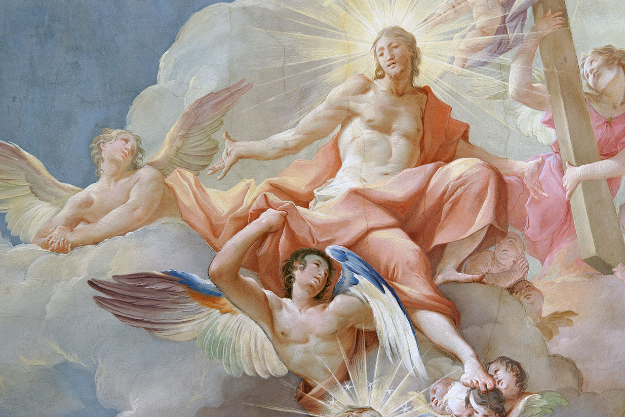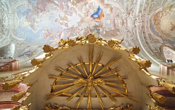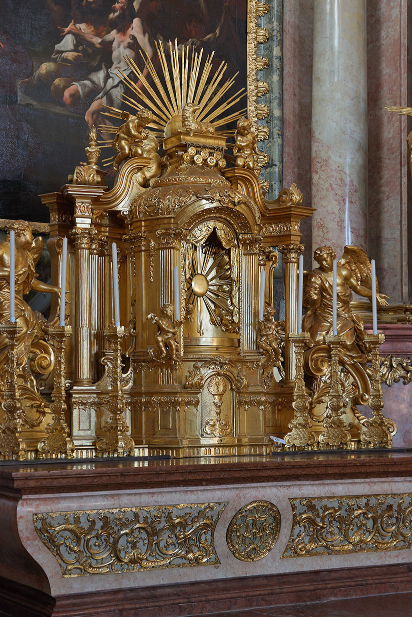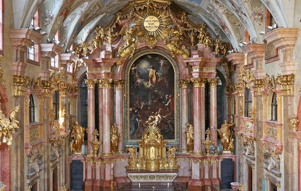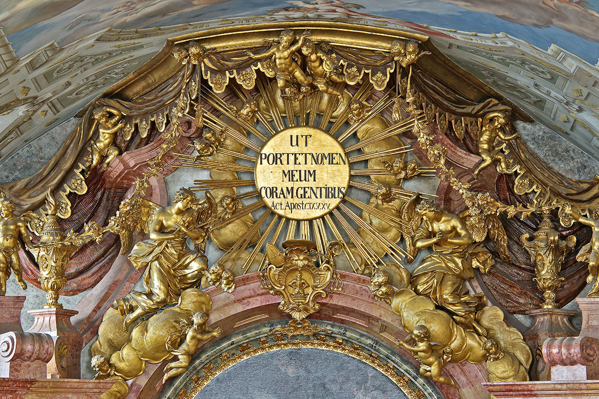 A templom freskóit a tiroli származású, itáliai tanultságú, majd Bécsben letelepedő és az Akadémia vezető mestereként számon tartott Paul Troger alkotta. A szentély mennyezetén Szent Ignác lelkének mennybevitele látható, mely színezésében főként velencei mintaképeket követ, plasztikus ereje, sodró lendülete révén viszont Gian Lorenzo Bernini „Theatrum sacrum”-ának festett változata. A mennyezet pillérkötegre lefutó, trapéz alakú mezőiben a négy evangélista figurája jelenik meg. Lukács alakja egyben Troger önarcképe, írótábláján a mester szignójával és 1744-es dátummal.