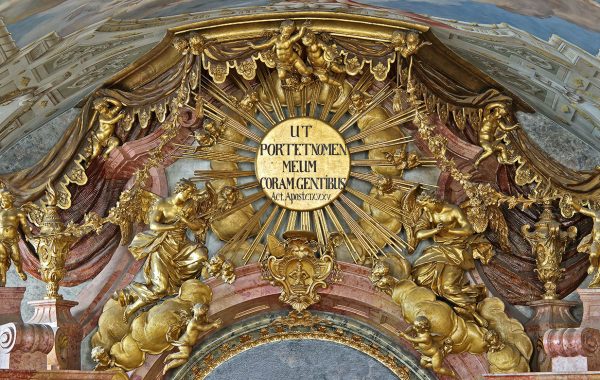 Alapítója Acsády Ádám veszprémi püspök volt, erre a főoltárkép keretének záródásán látható címer utal. A főoltár elkészítése 1743-44 között történt. A kép Szent Ignác apoteózisát ábrázolja, melyet Troger 1743-ban Bécsben festett. Az építmény anyaga vörös mészkő, alkotója a győri Götzelmayer János volt. Többszörösen tagolt főpárkánya felett baldachin függ, amely bécsi mesterek munkája. Középen, sugárkoszorús medalionban Szent Pálra utaló idézet olvasható. Balra, kívül Szent Péter alakja látható attribútumaival, belül pedig Szent József Jobbra, a belső oldalon Nepomuki Szent János szobra áll, kívül Szent Pál apostol alakja foglal helyet. Az életnagyságot meghaladó, fából készült, aranyozott figurák alkotója a bécsi Johann Joseph Rössler, aki a pozsonyi Georg Raphael Donner tanítványa volt. Mesterének hatását jól mutatja a főoltár-tabernákulum két adoráló angyalának megfogalmazása. Legfelül az Agnus Dei sugárkoszorú-övezte szoboralakja látható. Eredetileg a főoltárt díszítették Szent László és a koronafelajánló Szent István aranyozott, térdelő szobrai is. Ezek ma a Nagyasszonyunk kápolnáját díszítik.