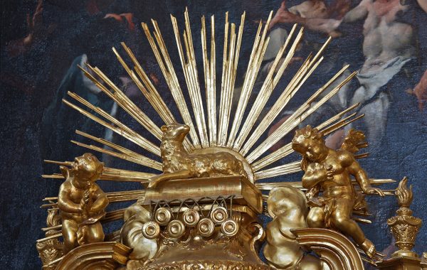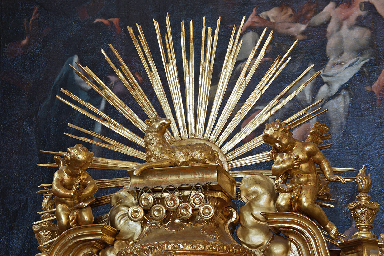 A Rozália megdicsőülését ábrázoló oltárkép ismeretlen olasz mester műve 1643-ból. A kép bal oldalán a másik két pestisszent: Rókus es Sebestyén jelenik meg. Fent mondatszalagokon „Veni Rosalia sponsa Christi, veni coronaberis” (Jöjj Rozália, Krisztus jegyese, jöjj, hogy megkoronáztassál) felirat olvasható. A képet balról Máté, jobbról Márk evangélista szobrai kísérik, az oromképen Keresztelő Szent János prédikációját látjuk, amely Medvey Lajos műve 1948-ból. A kép baloldalán Lukács, jobbra János evangélista szobrai állnak. Az oltár donátora Virgilio Beccaria kereskedő volt.