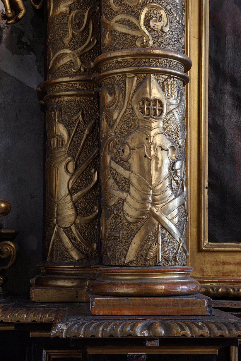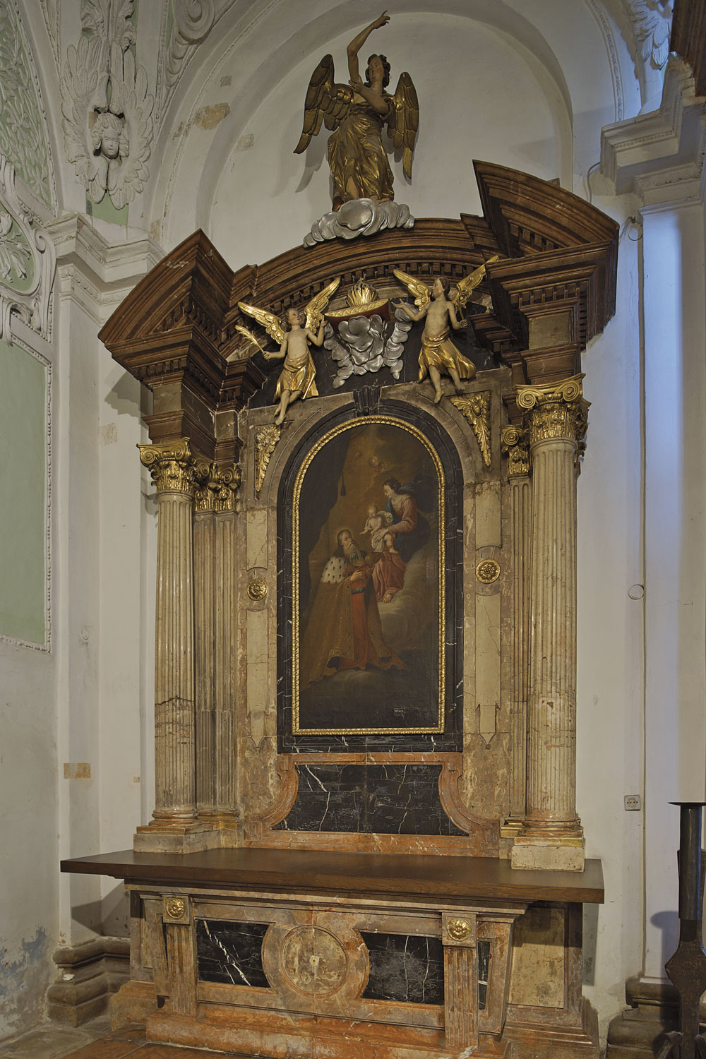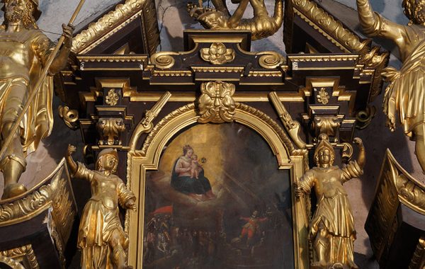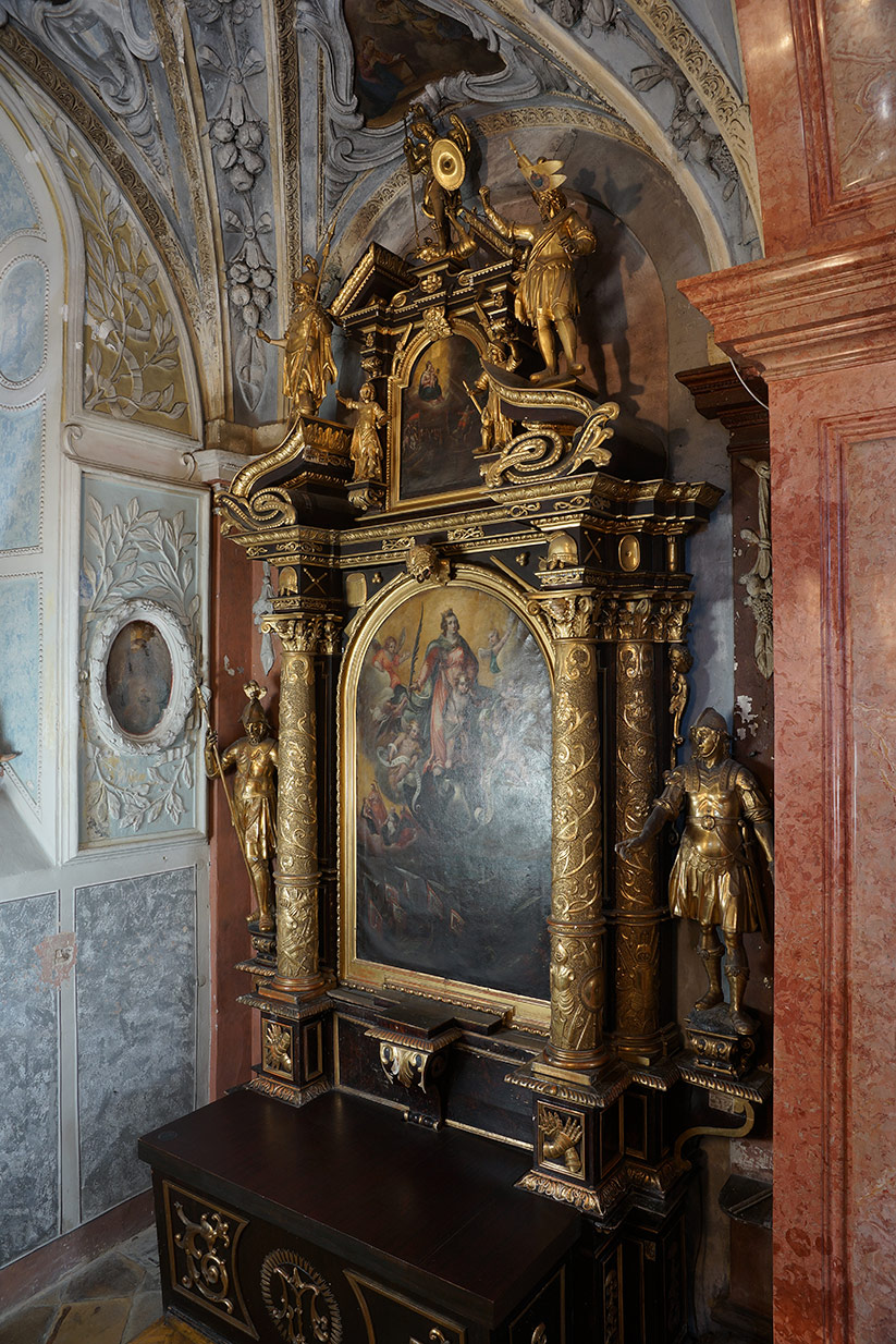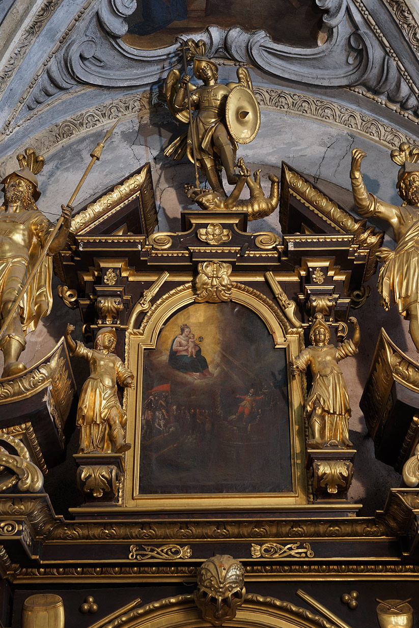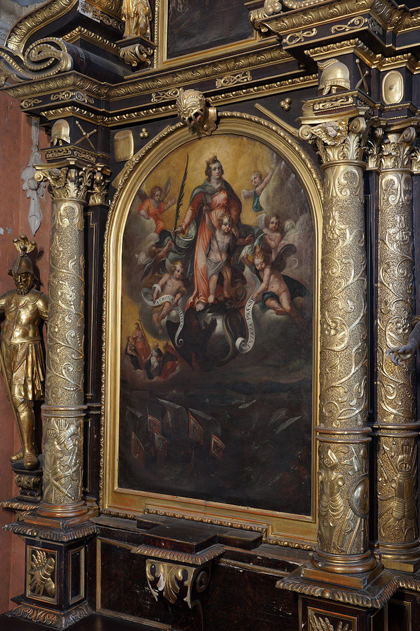 Az oltárt a vár német helyőrsége állíttatta 1642-ben. A középképen a „Győztes Immaculata” ikonográfiai típus első ábrázolása látható a török feletti győztes lepantói tengeri csata jelenete fölött. A Madonna jobbjában a dicsőség pálmaágát, baljával a kis Jézust tartja, aki hosszú szárú keresztjével döfi át a kígyót. Egy-egy angyal kíséri őket, írásszalagjukon „PATRONA MILITUM TUTELA PRAESIDII” (katonák patrónája, védők oltalma) felirattal. Balra a háttérben Jézus látható Mária, Péter és Pál társaságában. Az oltárképtől balra Szent Longinus, jobbra Szent György aranyozott szobra áll. Az oromképen a „Keresztények Segítsége”, Mária trónol felhőkön, az előtérben várostrom és imádkozó vitéz (valószínűleg a pamplonai erőd és Loyolai Szent Ignác) alakjával. Kétoldalt Szent Mór és Donát katonaszentek, az oromzat csúcsán pedig Mihály arkangyal szobrai láthatók.