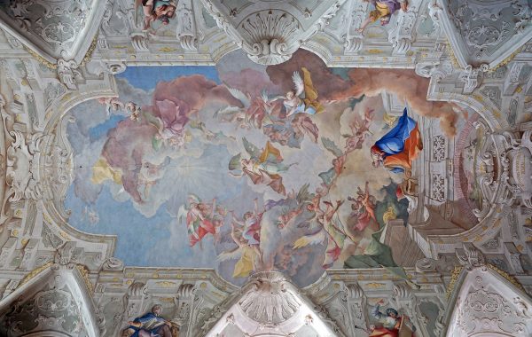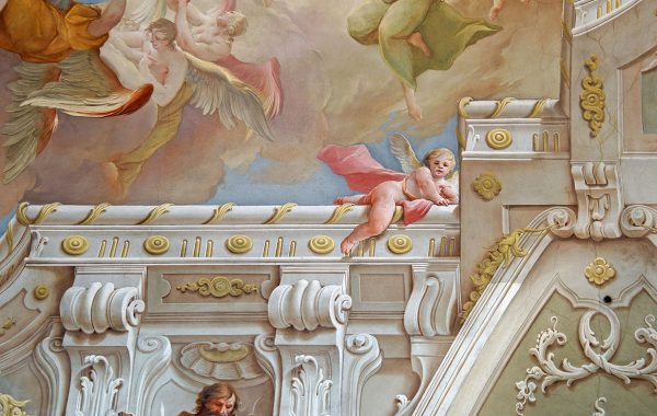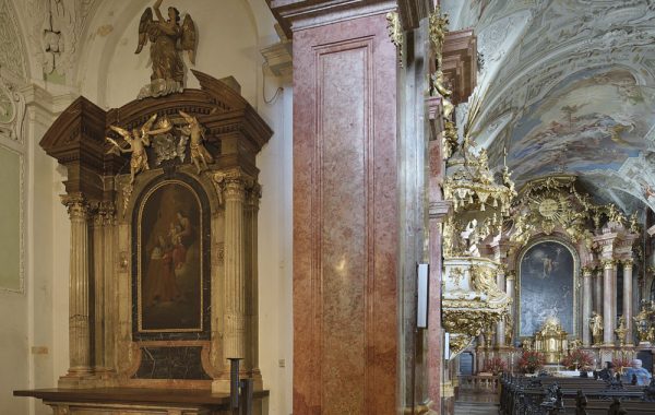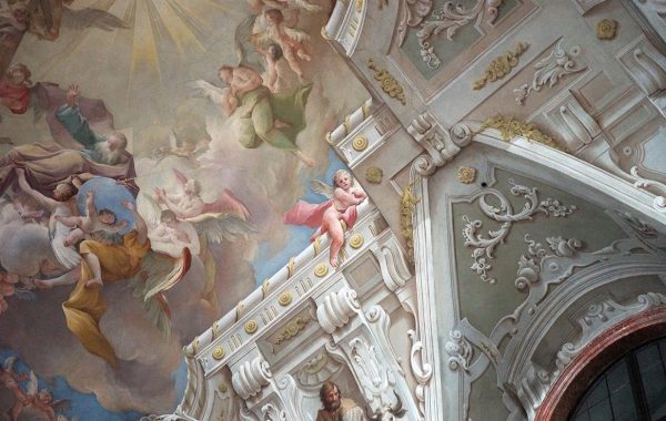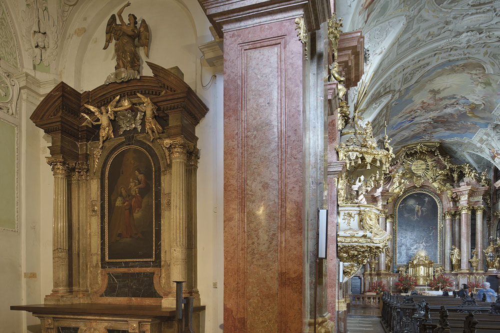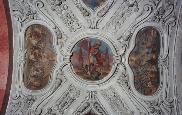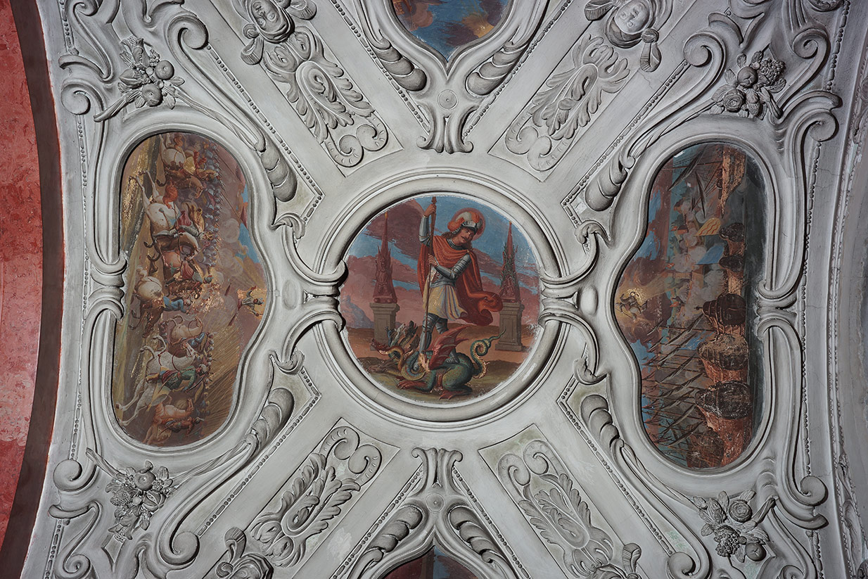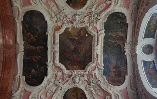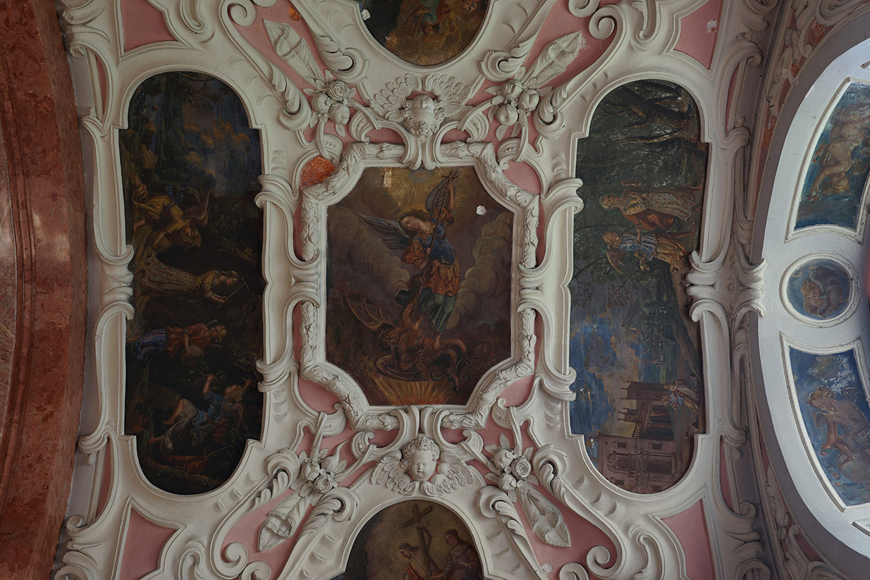 Az Őrangyal-kápolnában a Szent Rozália életét bemutató kvalitásos, manierista jellegű falfestményeket dús, naturalisztikus karakterű ornamentika övezi, amely voluták, visszahajló akantuszlevelek, gyümölcsökkel és virágokkal teli vázák, rózsa- és drapériadíszek, angyalfejek gazdag együttese. Ezek a díszítések 1650 körül készültek, és a rendházi lépcsőház és a patika mennyezeti stukkódíszeivel rokonok. A többi kápolna díszítése is e típusba tartozik, a Missziós kápolna kivételével.