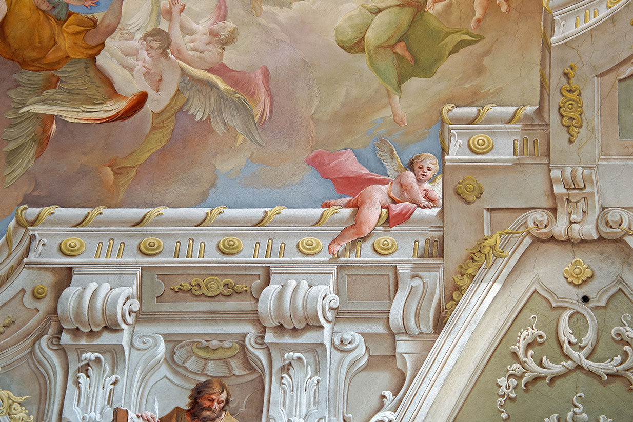 A hajó feletti dongaboltozatot az „Angyali üdvözlet” jelenete díszíti, mely 1747-ben készült. Az egységes térélményt adó elemeket képszerűen, keretbe vonva látjuk. Troger pasztell, ezüstös tónusvilága ezen a freskón jelenik meg először. Az ívmezőkben a négy nagy ótestamentumi próféta: Jeremiás, Ezékiel, Izaiás és Dániel élénk gesztusú figurái helyezkednek el. Az orgonakarzat felett a Zenélő angyalok ovális kompozíciója látható, melynek keretdísze már rokokó jellegű (1747). A karzat oldalfalaira Troger a valódi ablakokkal azonos, illuzionisztikus ablakokat festett. A déli fal „ablakán” át belső térbe látunk, ahol tárgyak találhatók, csendéletszerű megfogalmazásban. Az északi fal festett ablakának jobb felén középkorú, olvasó férfi alakját látjuk, a másik oldalon hangszereket. A megfogalmazás és fénykezelés a holland zsánerképeket idézi. Fontos a Trogerrel dolgozó architektúrafestőt, Gaetano Fantit megemlíteni, aki eredetileg díszletfestő volt és a Bibbienák hatása alatt állott. Troger másik győri munkatársa Caspar Sambach volt, aki a székesfehérvári jezsuita templom karzatán alkalmazta az ablakban olvasó férfi motívumát (1748). A freskókat övező „architektúrának” szinte pontos mása a győri orsolyiták Schaller István-féle freskóin tűnik majd fel 1762— 64-ben.