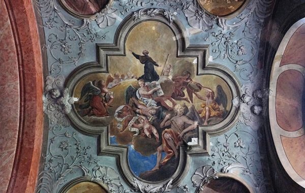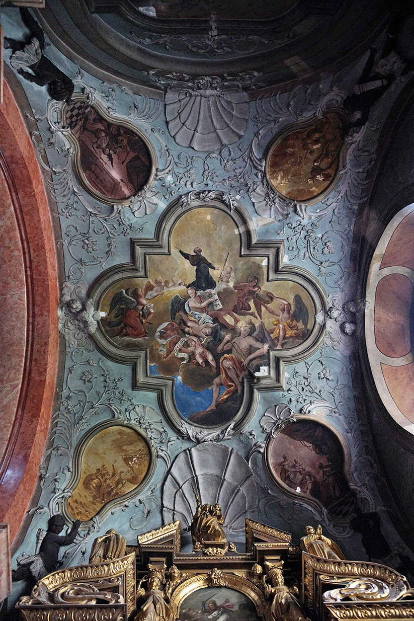 Az eredetileg Xavéri Szent Ferenc tiszteletére szentelt Missziós kápolna mennyezeti stukkódíszítésének alkotója ugyanaz az olasz stukkóműves kolónia, amely a rendházban is tevékenykedett. A szent térítő tevékenységére utaló középképet és a sarkok grisaille-kompozícióit finoman rajzos, dekoratív inda- és virágdísz borítja el. Ezt a sarkokon kagylók és angyalfejek plasztikus elemei ellensúlyozzák. Ez a dekoratív, rajzos karakterű stukkódísz 1670-90 táján készült és a rendház refektóriumának mennyezetén is feltűnik.