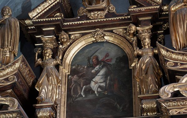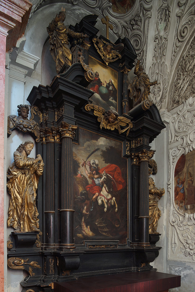 Az adományozó Leonies György volt, aki az oltárt 1656-ban emeltette a törökellenes harcok segítőszentje (s egyben saját védőszentje) számára. A manierista stílusú középképen a fehér lovon Sárkányölő Szent György látható. Az oromképen a Szentháromság ábrázolását láthatjuk, ezt balról Szent Borbála, jobbról Alexandriai Szent Katalin szobrai kísérik. A kvalitásos németalföldi, késő reneszánsz jellegű oltárépítmény (retabló) fő díszei a gyöngysordíszes oszlopok, valamint a jellegzetes angyalfejes es ún. „porcdíszes” szárnyornamensek.