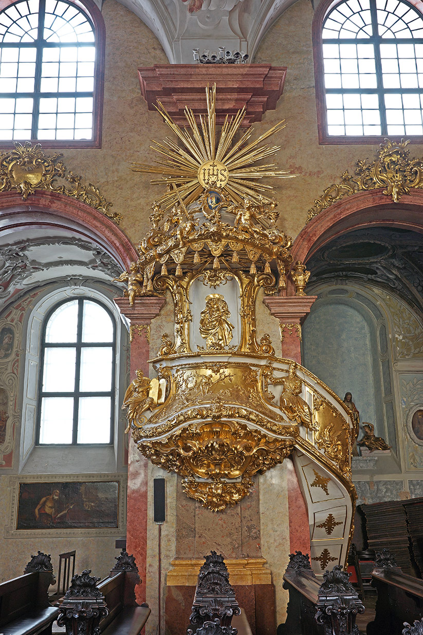 A szószéket Padányi Bíró Márton veszprémi püspök költségén a Pozsonyban dolgozó Donner-tanítvány, Ludwig Gode készítette 1748-49 között. Mesterének hatása itt erősen kimutatható. A szószéket baldachinszerű, rojtdíszes hangvető koronázza, belső oldalán a Szentlélek galambjával. A szószékkosarat borító két „festői” relief Keresztelő Szent János prédikációját ábrázolja. A mellvéd bal oldalán Mózes szobra látható a kőtáblákkal, jobbra pedig Áron pátriárka, füstölővel. A hátfalon a Jó Pásztor aranyozott domborműve található. A feljáró oldalának reliefjei a nyugati egyházatyákat, Szent Jeromost, Szent Ágostont, Szent Ambrust és Nagy Szent Gergelyt ábrázolják.