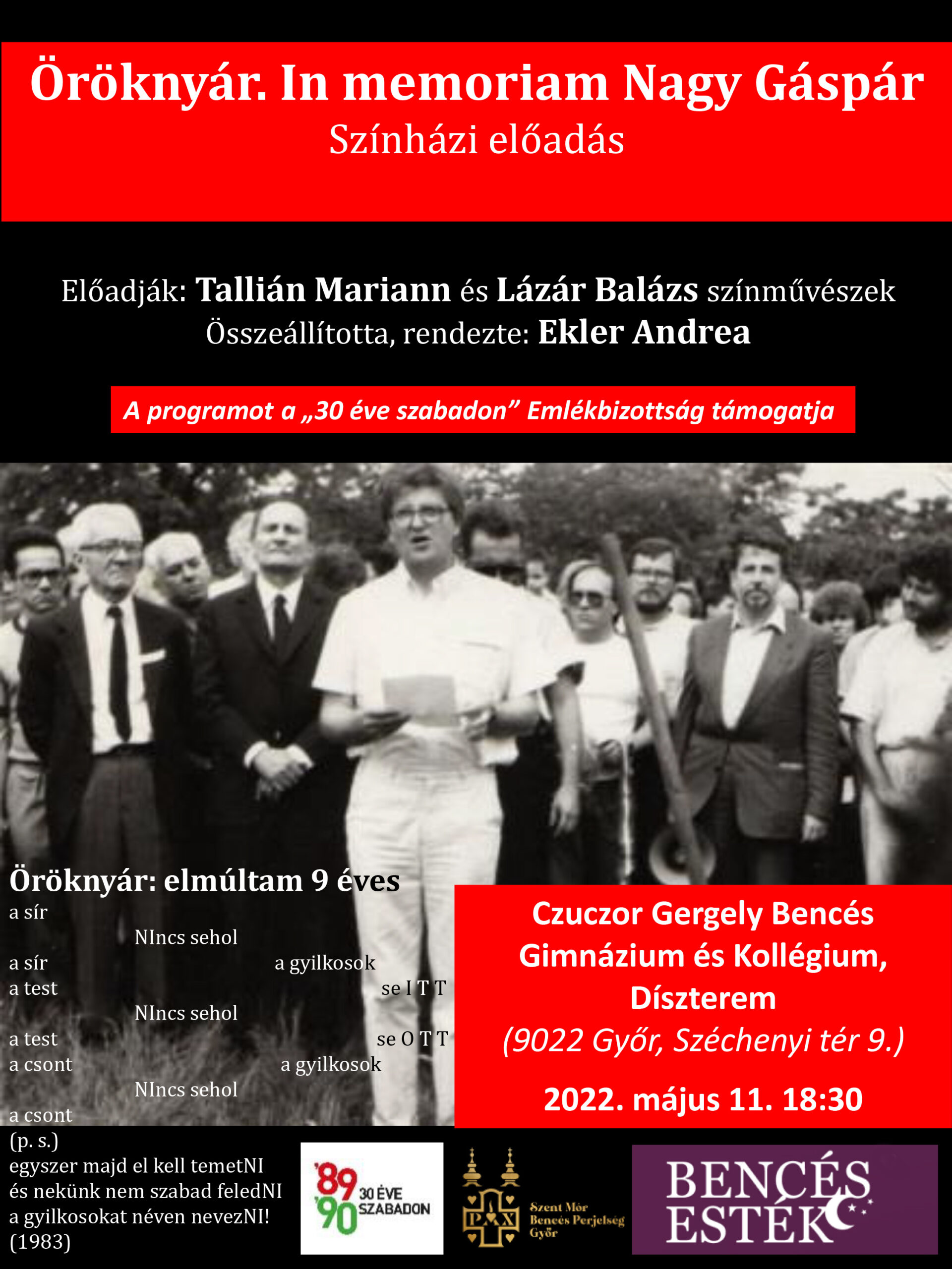 Az egykori pannonhalmi diákra, Nagy Gáspár költőre (1967A) emlékezünk Tallián Mariann és Lázár Balázs versszínházi előadásával.