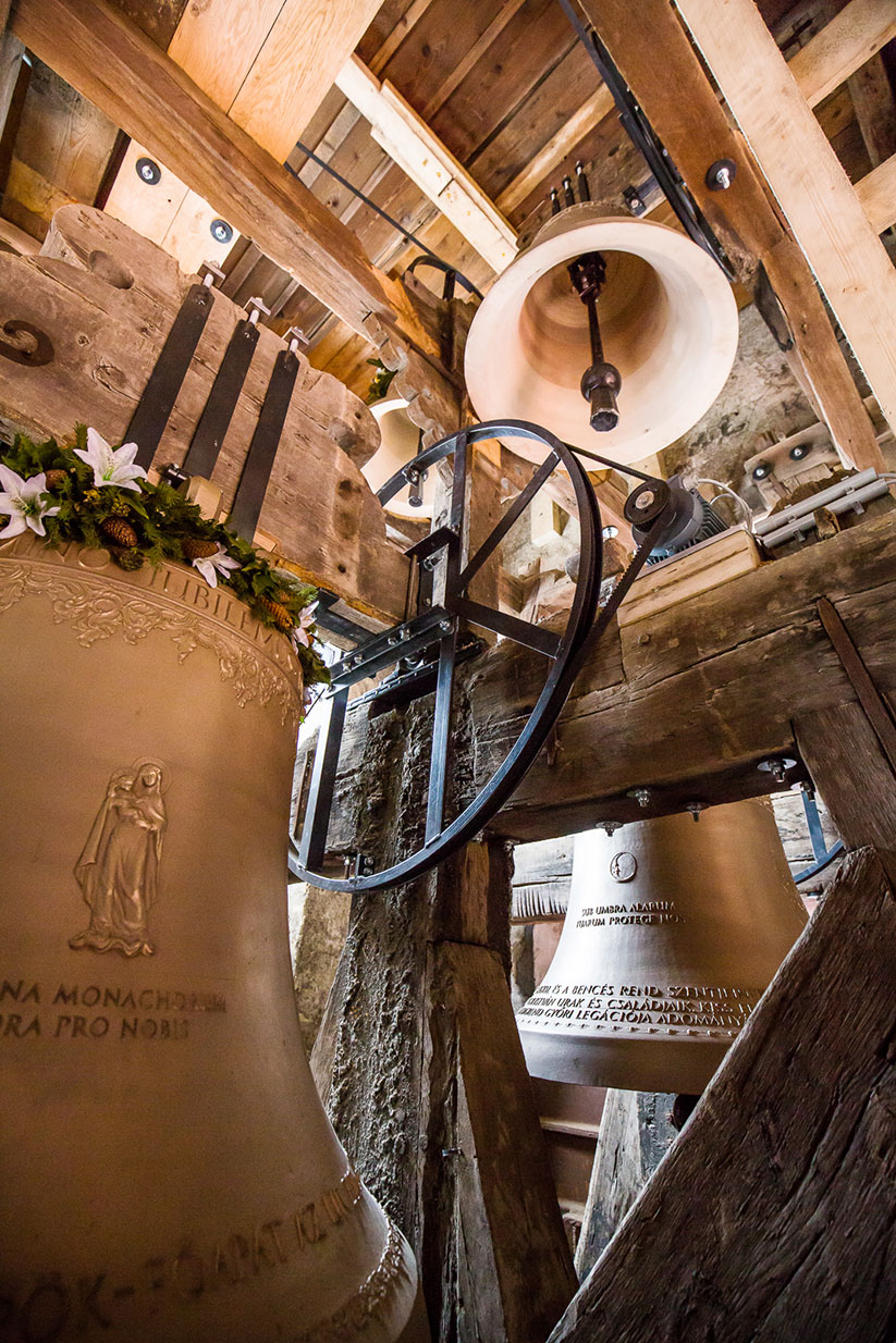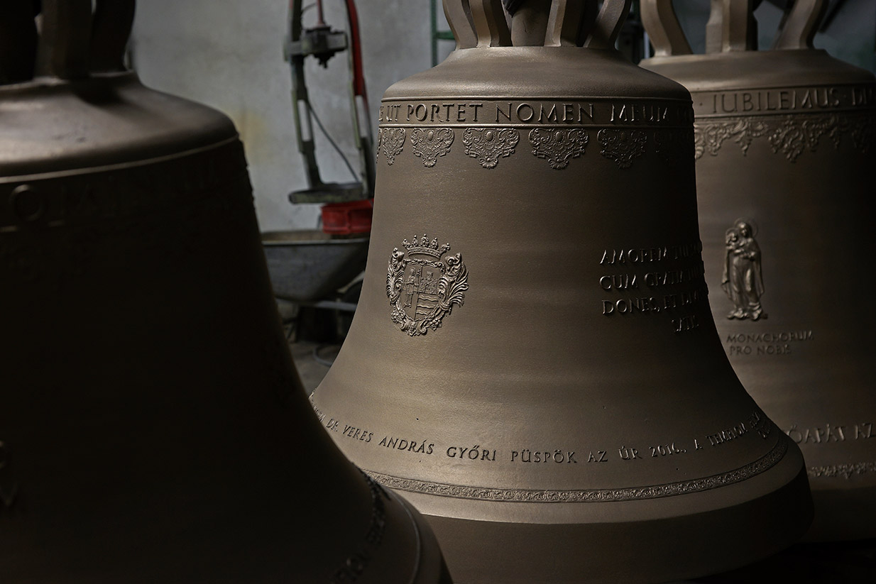 A bencés templom harangjait – a Szent Benedek-harang kivételével – 1916-ban háborús célra elrekvirálták. Száz év után, 2016-ban szerzetesközösségünk Győr városával és polgáraival összefogva pótolta az elpusztult harangokat. Méretüket és eredeti hangképüket a fennmaradt harangszék, nyelvek és jármok méretei, valamint levéltári források alapján pontosan rekonstruálták. Az új harangokat 2016. október 28-án öntötték Innsbruckban, a Grassmayr harangöntödében, a győri bencés atyák és az adományozók küldöttségének imádságos jelenlétében.