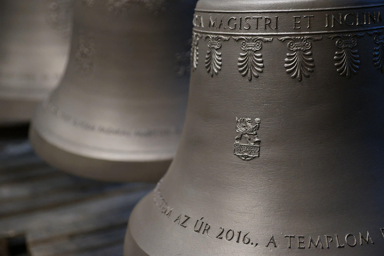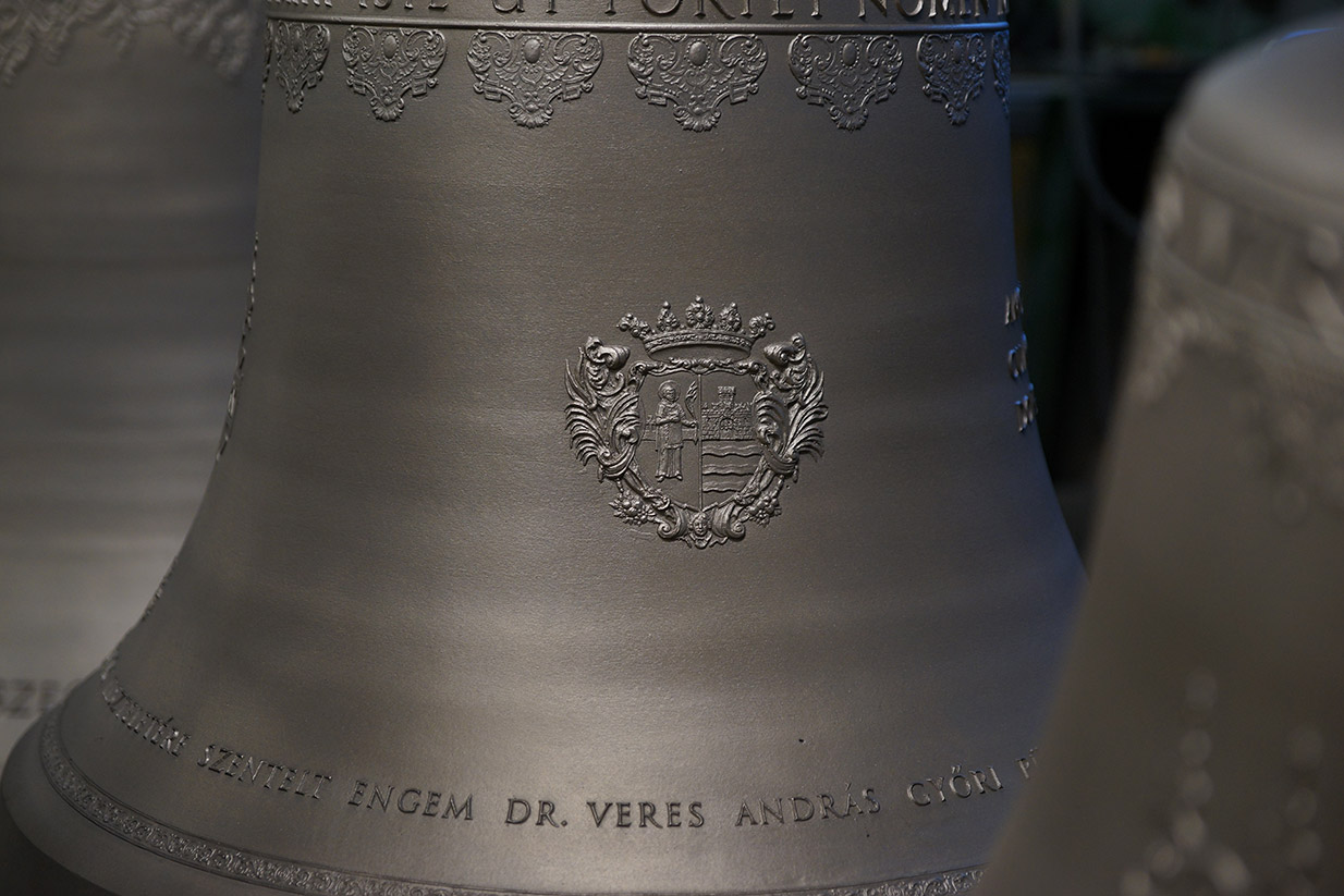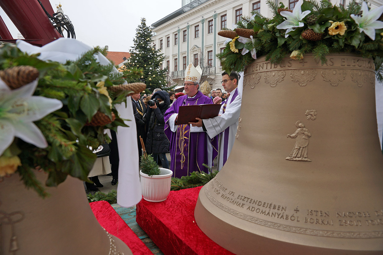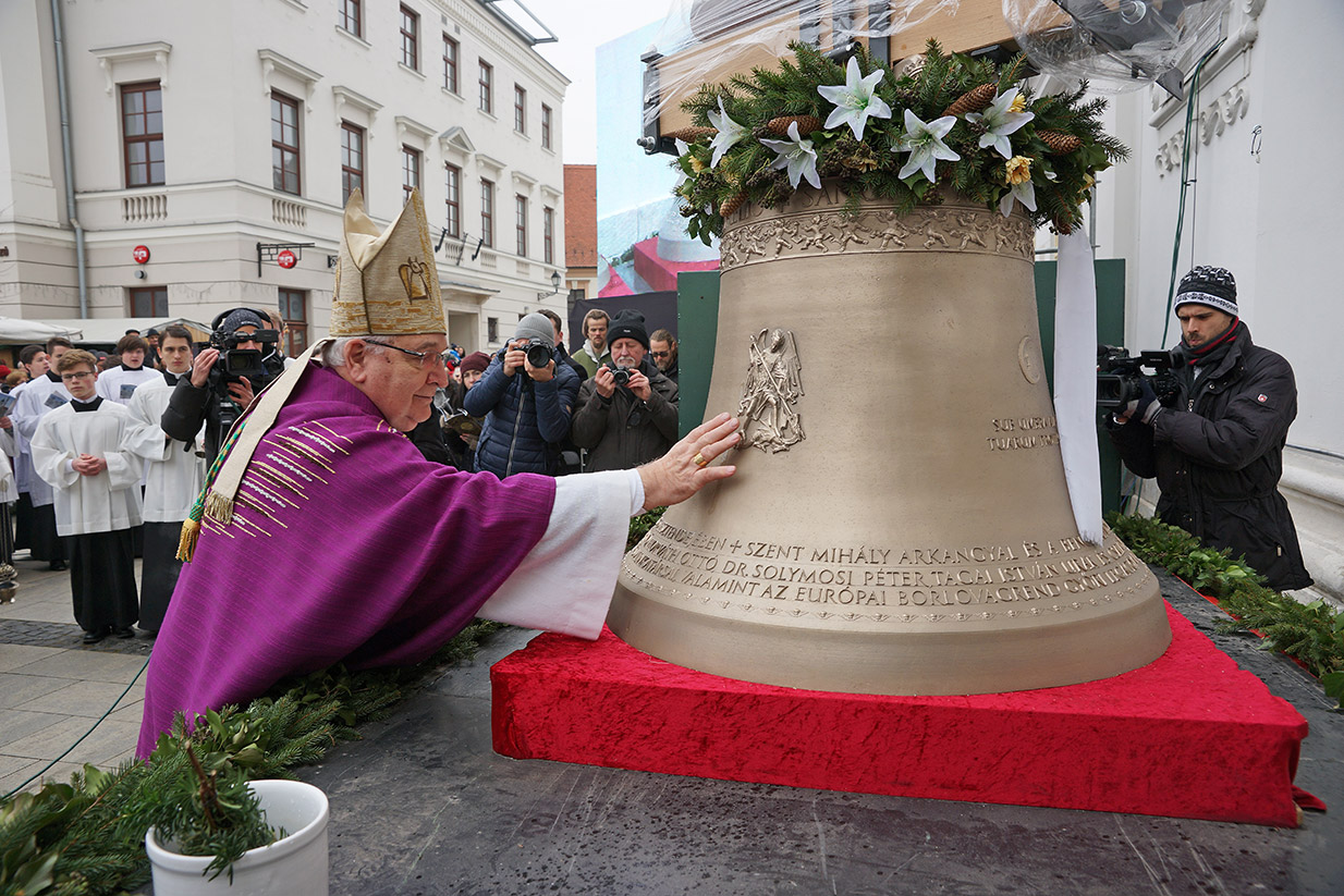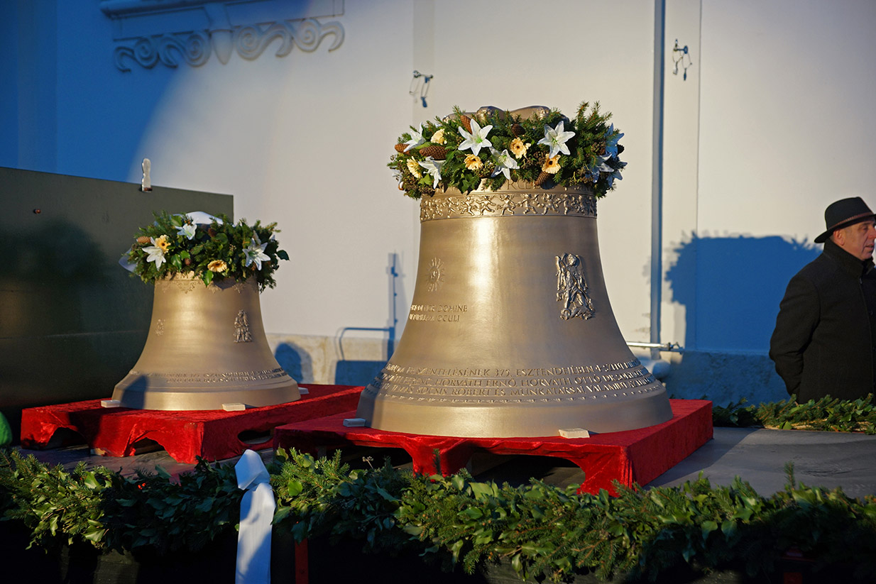 A harangok a tiroli fővárosból Rómába utaztak, ahol december 7-én Ferenc pápa délelőtti audienciája előtt megáldotta őket. December 11-én érkeztek Győrbe, ahol ünnepélyes menet kísérte őket a Városháza elől a Széchenyi térre. A harangokat egyhetes közszemle után december 18-án, Advent IV. vasárnapján szentelte fel Dr. Várszegi Asztrik püspök, pannonhalmi főapát, Dr. Veres András győri püspök és Fazakas Márton csornai apát. A Szent Benedek-harang és újraöntött társai első együttes megszólalása Urunk születésének örömünnepét hirdette meg Karácsony éjszakáján, az éjféli szentmise előtt.