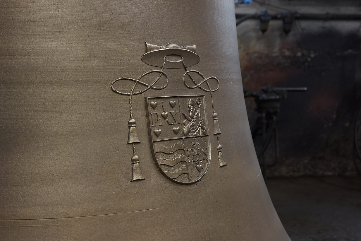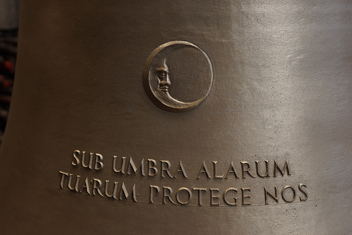 A harang fő dísze a sátánt letaszító Szent Mihály arkangyal domborművű ábrázolása, vele szemben a bencés templom logója és az öntöde jele látható. Mivel e harang fogja jelezni a reggeli és esti Úrangyala-imádság idejét, keleti oldalán a Nap, nyugati oldalán a Hold képe áll a 17. zsoltár 8.versének egy-egy sorával: CUSTODI NOS, DOMINE UT PUPILLAM OCULI – SUB UMBRA ALARUM TUARUM PROTEGE NOS (Mint szemed fényére, vigyázz reánk, Urunk! Szárnyaidnak árnyékával takarj be minket!)