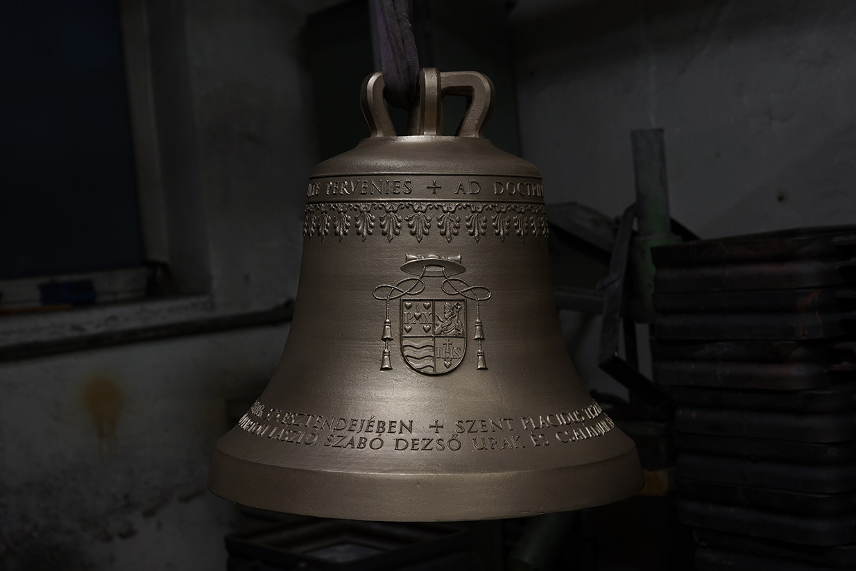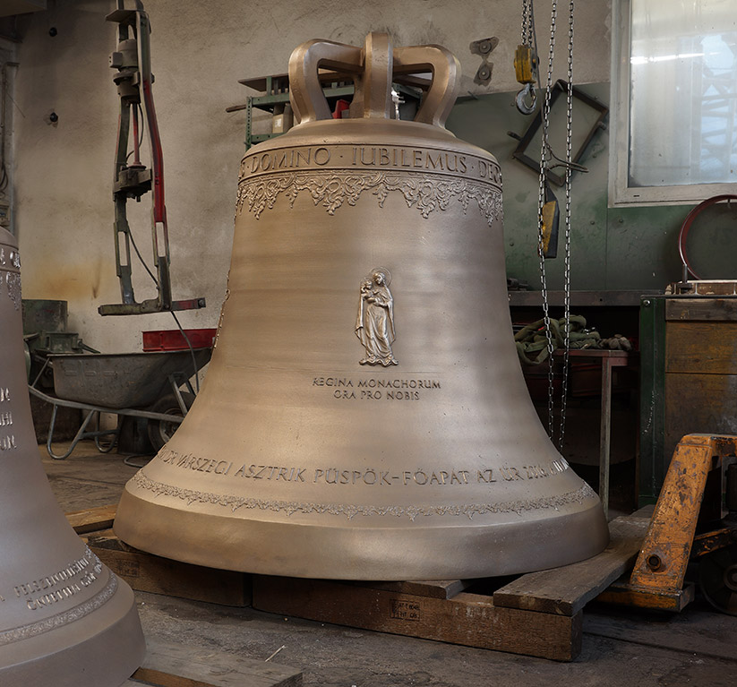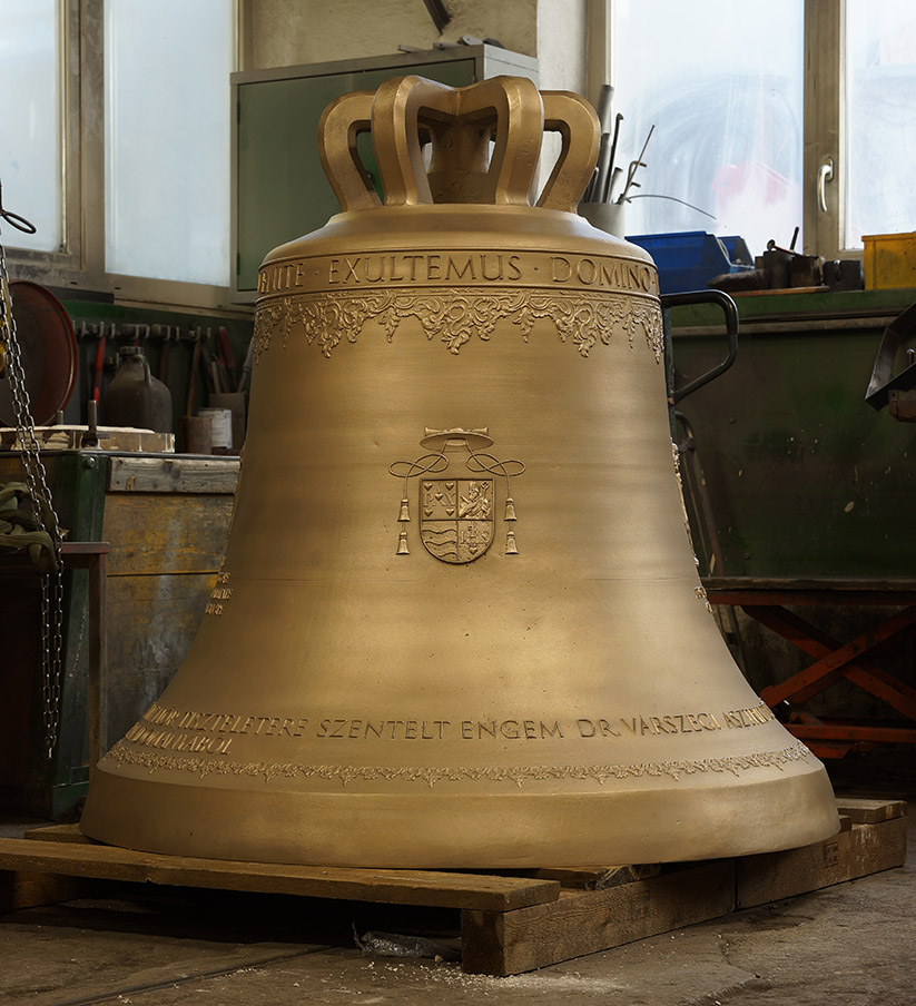 Kétoldalt a perjelség címere, illetve az öntöde jele, a harangot tartó griff látható magyar nyelvű felirattal: TŰZ HEVE OLVASZTOTT EGGYÉ ENGEM, GRASSMAYR ÖNTÖTT INNSBRUCKBAN