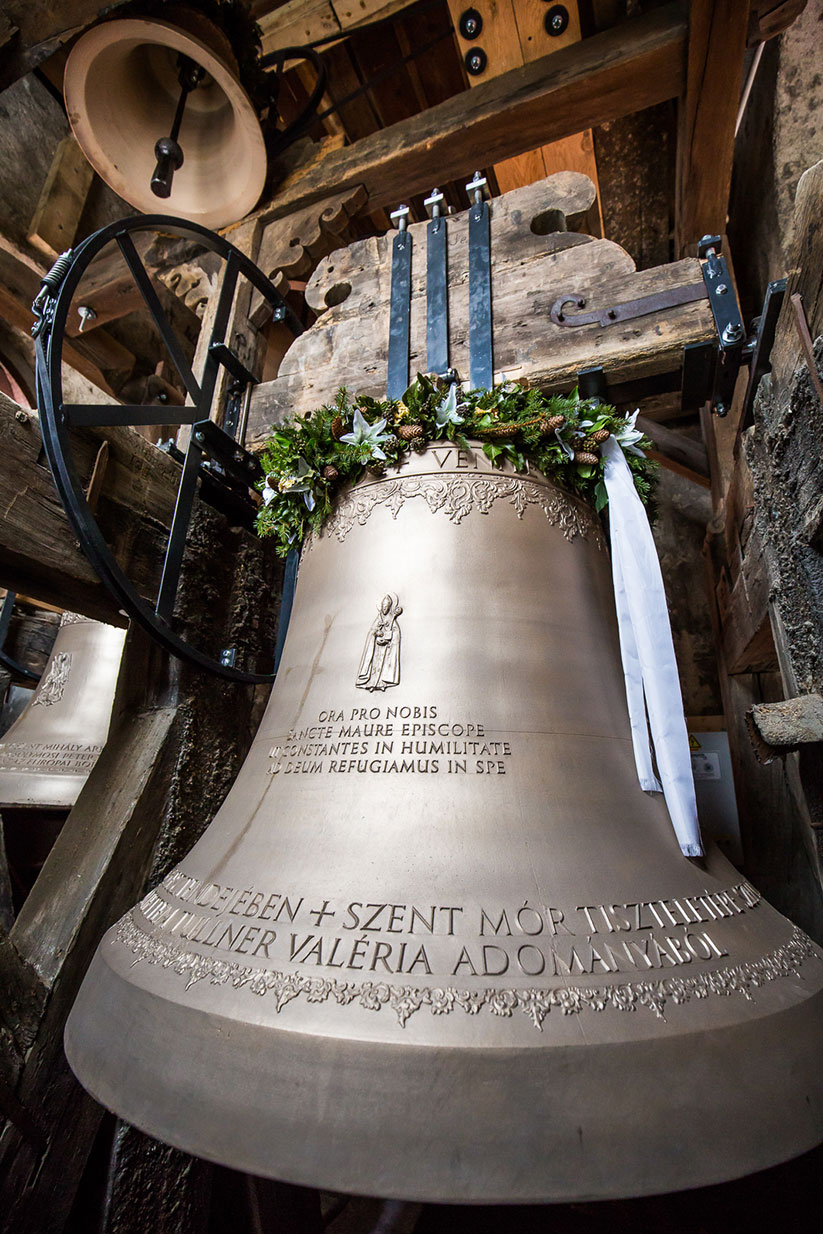A harangon Szent Mór püspök domborműve alatt a következő fohász áll: ORA PRO NOBIS SANCTE MAURE EPISCOPE UT CONSTANTES IN HUMILITATE AD DEUM REFUGIAMUS IN SPE (Szent Mór püspök könyörögj értünk, hogy alázatosan álljunk és reménykedve Istenhez meneküljünk.)