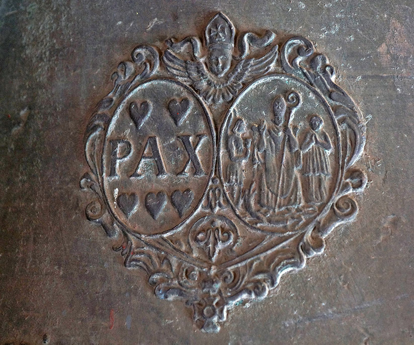 Alsó körirata: SZENT PLACIDUS TISZTELETÉRE SZENTELTETTEM AZ ÚR 2016., A TEMPLOM FELSZENTELÉSÉNEK 375. ESZTENDEJÉBEN