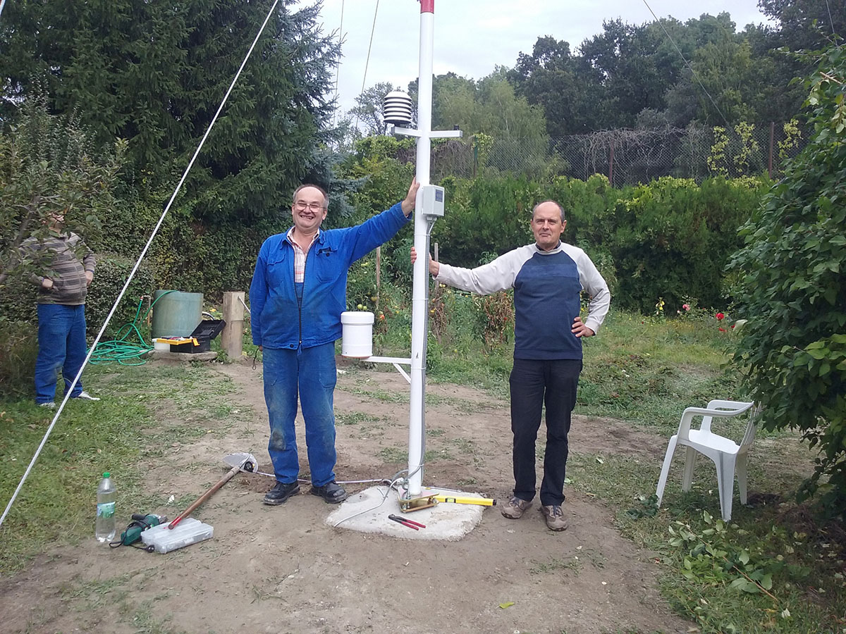 Mindjárt hozzátenném, az állomást oktatási célból telepítettük, nem tartozik az OMSZ hálózatába, de mérési pontossága megközelíti az OMSZ-os állomásokét. A telephelyünkön kijelölhető legoptimálisabb helyen állítottuk fel, természetesen a 10 m-es árbócon lévő szélmérőt így is zavarják a távolabbi környezet magas fái, de a focipályára nem tehettük, ez keresztülhúzná a két év “múlvai” BL döntőre való kandidatúránkat. Célunk, hogy minél szélesebb közönség láthassa az adatokat, különösen diákjaink.. Még egyszer köszönöm mindenkinek, aki bármilyen szintű anyagi-szellemi támogatást nyújtott az állomás felállításához. Természetesen ezzel a bicajtúrákra, pinnyédi sütésekre való előrejelzési kapacitásunk nem növekedett, viszont testközelből figyelhetjük meg a globális felmelegedés jeleit.