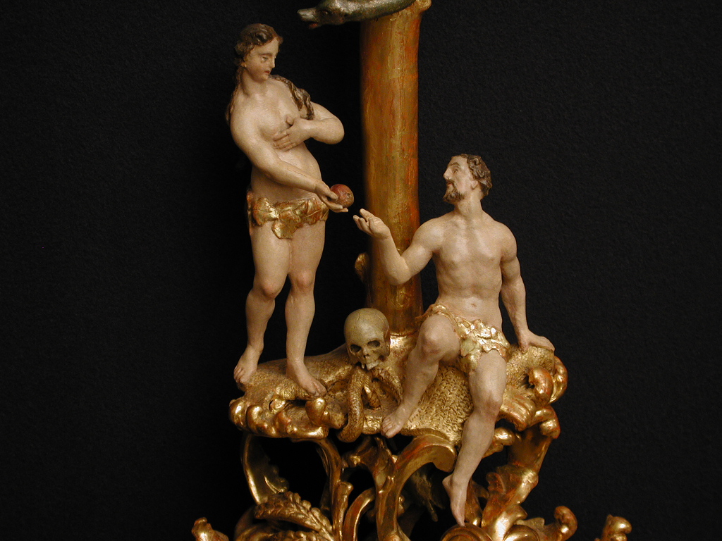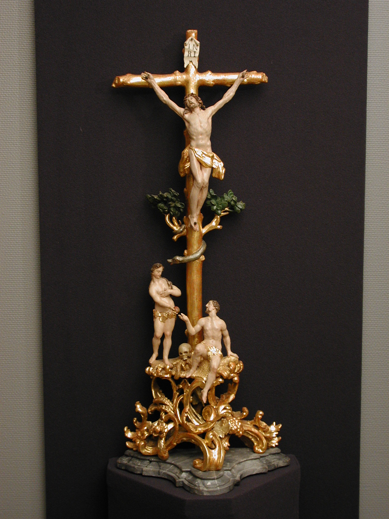 Részlet egy barokk keresztről, amit a győri bencés házban őriztek még a jezsuita korszakból. A kereszt tövében a bűnbeesés jelenete. A művész a Szent Kereszt teológiáját ábrázolta. A megváltás műve megtöri az ősbűn átkát és új szövetséget hoz létre Isten és ember között.
