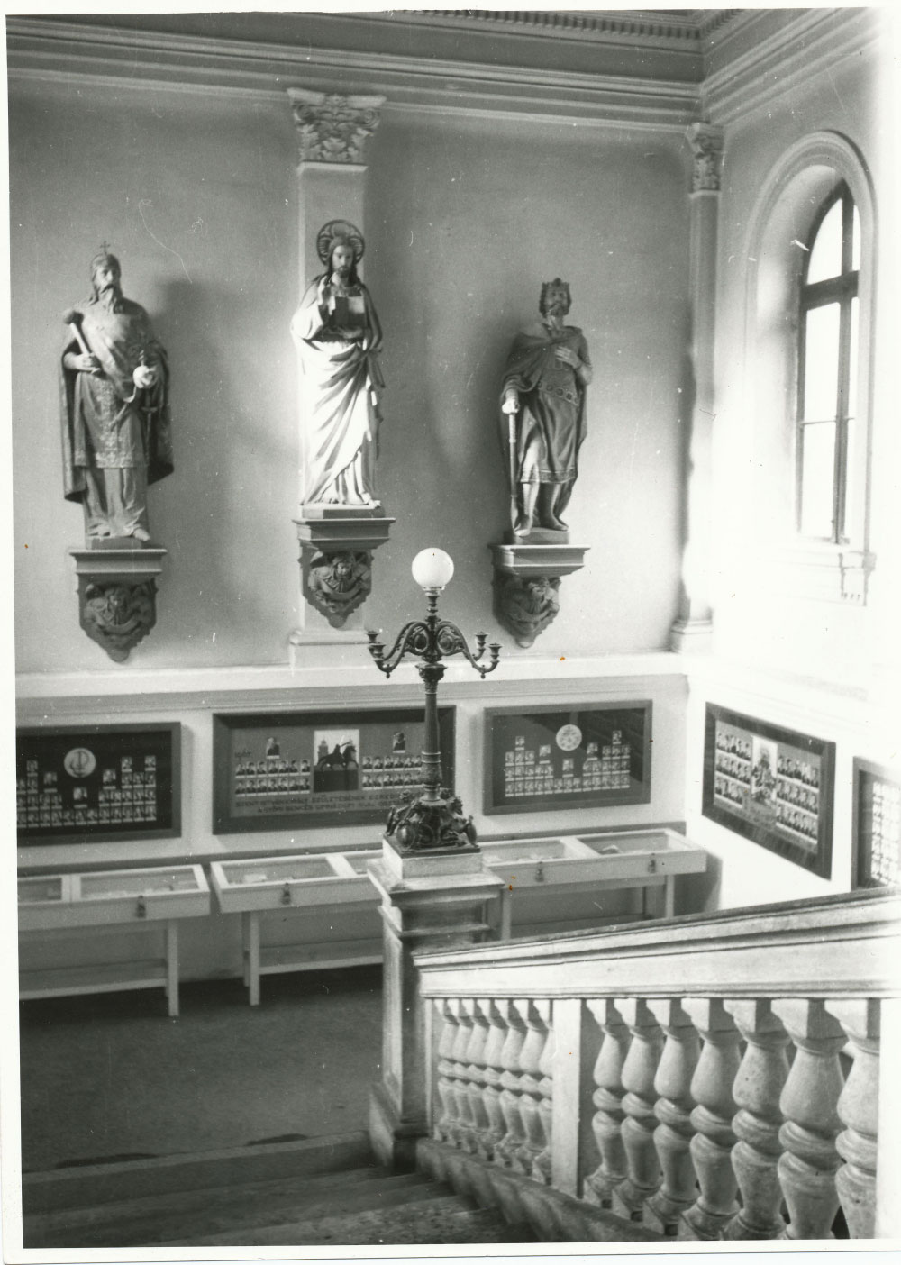 A gimnázium lépcsőházában középen Jézus Szíve szobor, mellette Szent István és Szent László király alakja. Ma a múzeum raktárában őrzik őket.